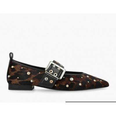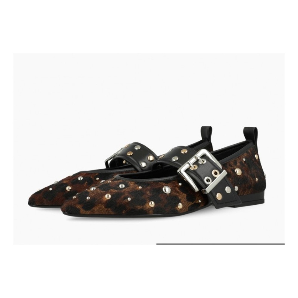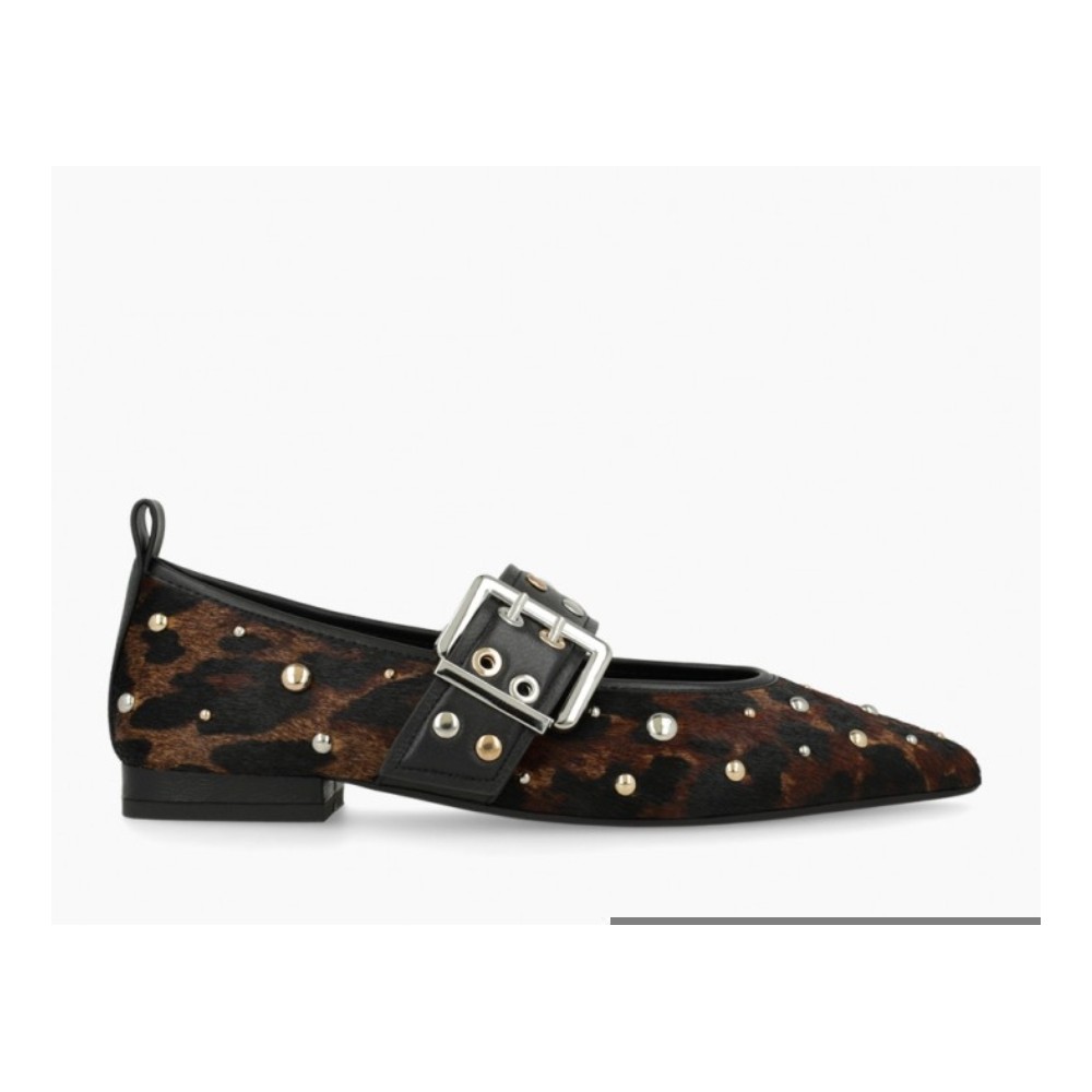 Bailarinas de piel con detalle de estampado animal print, tira al empeine en negro y tachas metálicas.