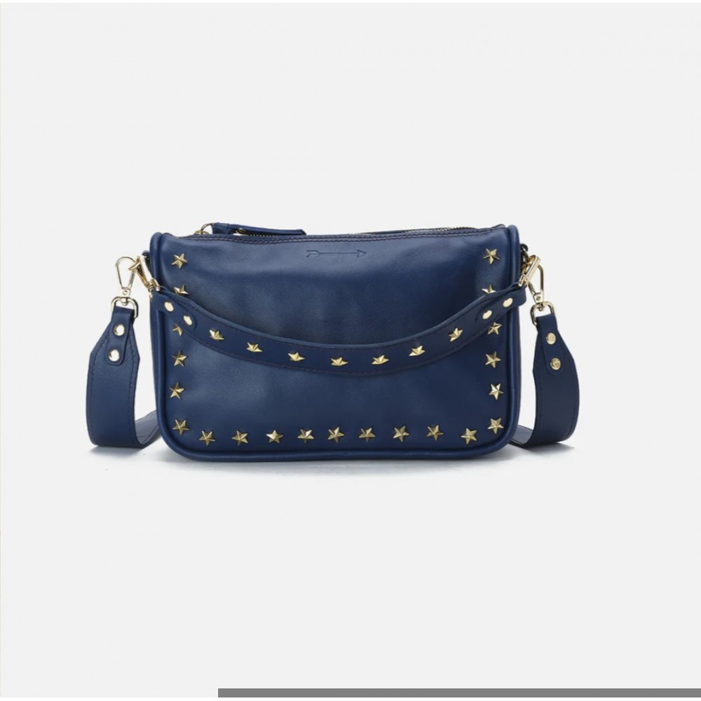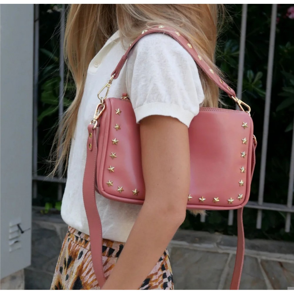 Sandy es el bolso perfecto para tu día a día. Bolso de piel con doble asa desmontable para que lo puedas llevar de mano, de hombro o bandolera. Ribeteado con estrellas en dorado queda perfecto para darle un toque especial a tu outfit.
