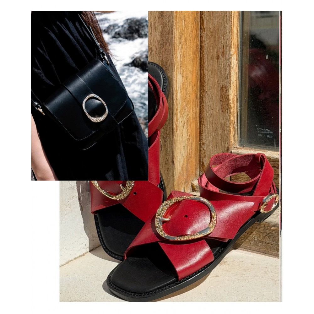 Sandalia de piel en rojo intenso con detalle de hebilla dorada