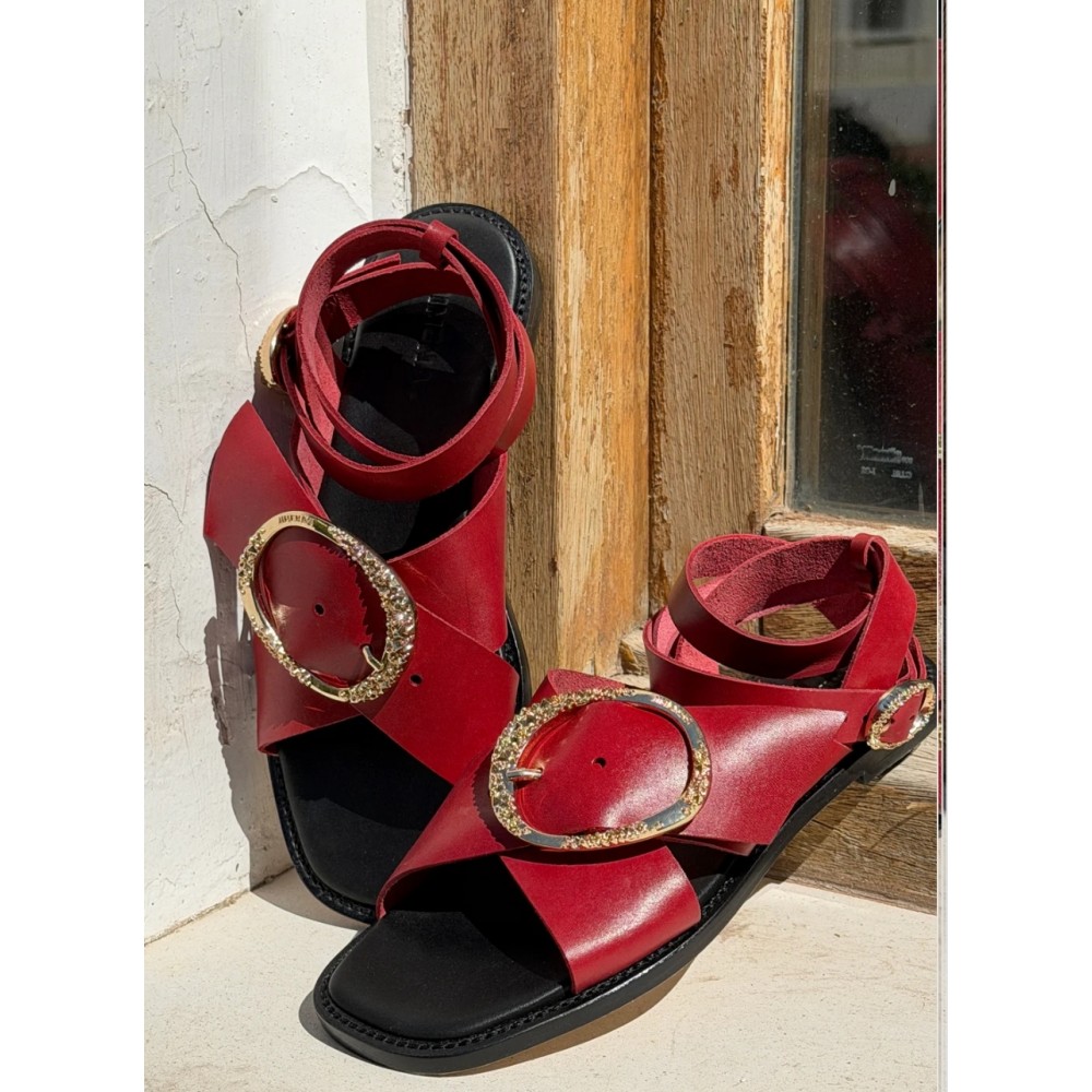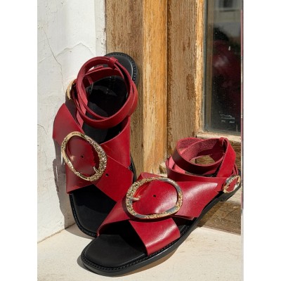 Sandalia de piel modelo Figue en rojo intenso. Modelo atemporal con el toque de luz del tono intenso y de la hebilla en dorado. De pala cruzada que se ajusta en el tobillo y planta mullida, va a ser tu modelo más especial en el zapatero.
